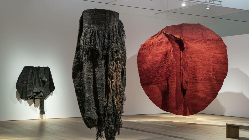 Le parcours se poursuit sur le cycle d’œuvres monumentales qu’Abakanowicz entame au milieu des années 1960 : les Abakans, de spectaculaires pièces textiles suspendues au plafond. Malgré une pénurie de matériaux, l’artiste tisse ces objets en fibres naturelles à l’aide de cordes et tissus de récupération pliés sous son lit. En 1969, la quatrième Biennale internationale de la tapisserie à Lausanne marque un tournant décisif : affranchi du support de la cimaise, l’Abakan rouge de 4 mètres de diamètre se déploie sous toutes ses coutures.