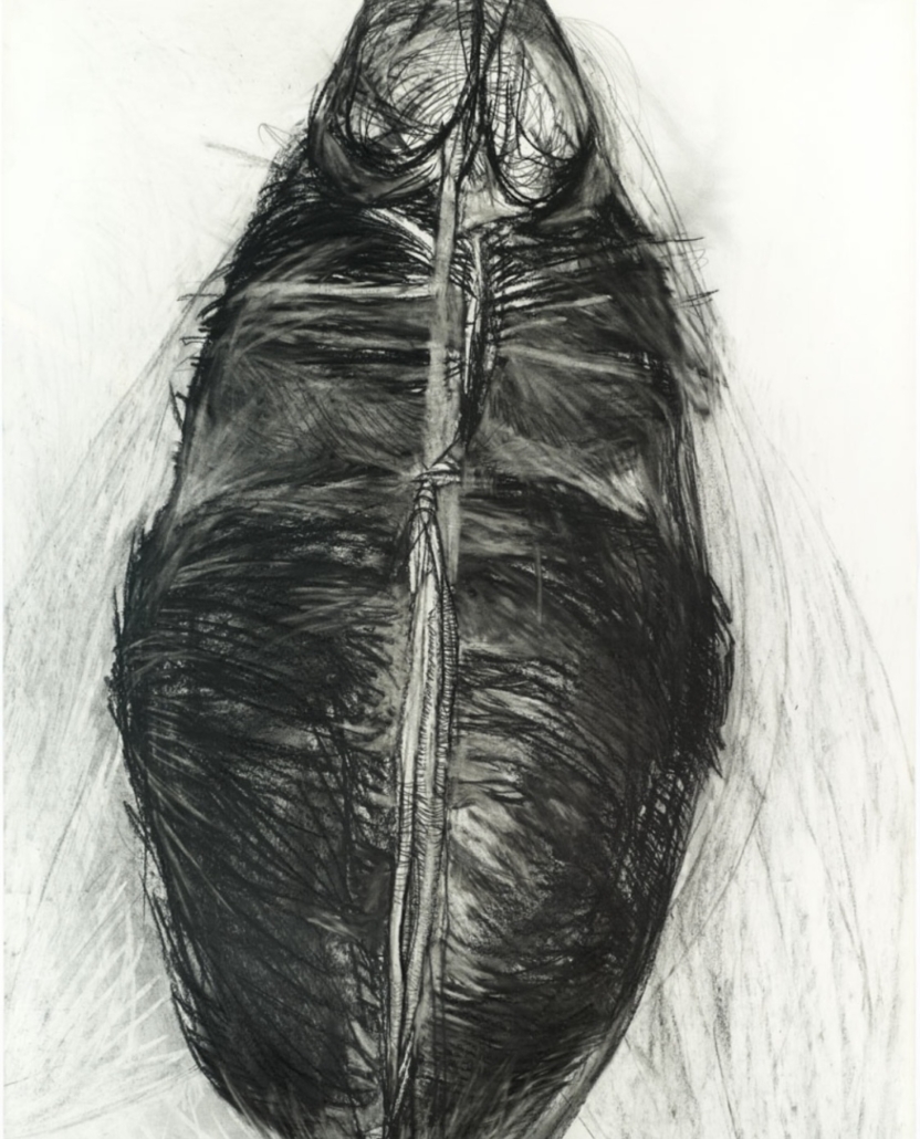 Au début de sa carrière, Abakanowicz recourt ponctuellement au dessin pour représenter le monde végétal ou animal. À compter des années 1980, elle intensifie sa pratique de l’art graphique. La série au fusain des Mouches (1993-1994) transpose dans un format monumental l’observation de mouches mortes ou à l’état de pupe. Abakanowicz en agrandit le corps, comme sous l’oculaire d’un microscope, pour révéler leur structure. Loin d’une angoisse de la décomposition, l’artiste manifeste sa curiosité viscérale de la réalité organique.