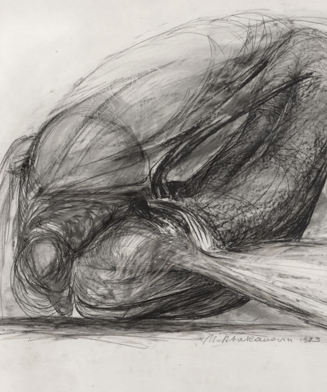Au début de sa carrière, Abakanowicz recourt ponctuellement au dessin pour représenter le monde végétal ou animal. À compter des années 1980, elle intensifie sa pratique de l’art graphique. La série au fusain des Mouches (1993-1994) transpose dans un format monumental l’observation de mouches mortes ou à l’état de pupe. Abakanowicz en agrandit le corps, comme sous l’oculaire d’un microscope, pour révéler leur structure. Loin d’une angoisse de la décomposition, l’artiste manifeste sa curiosité viscérale de la réalité organique.