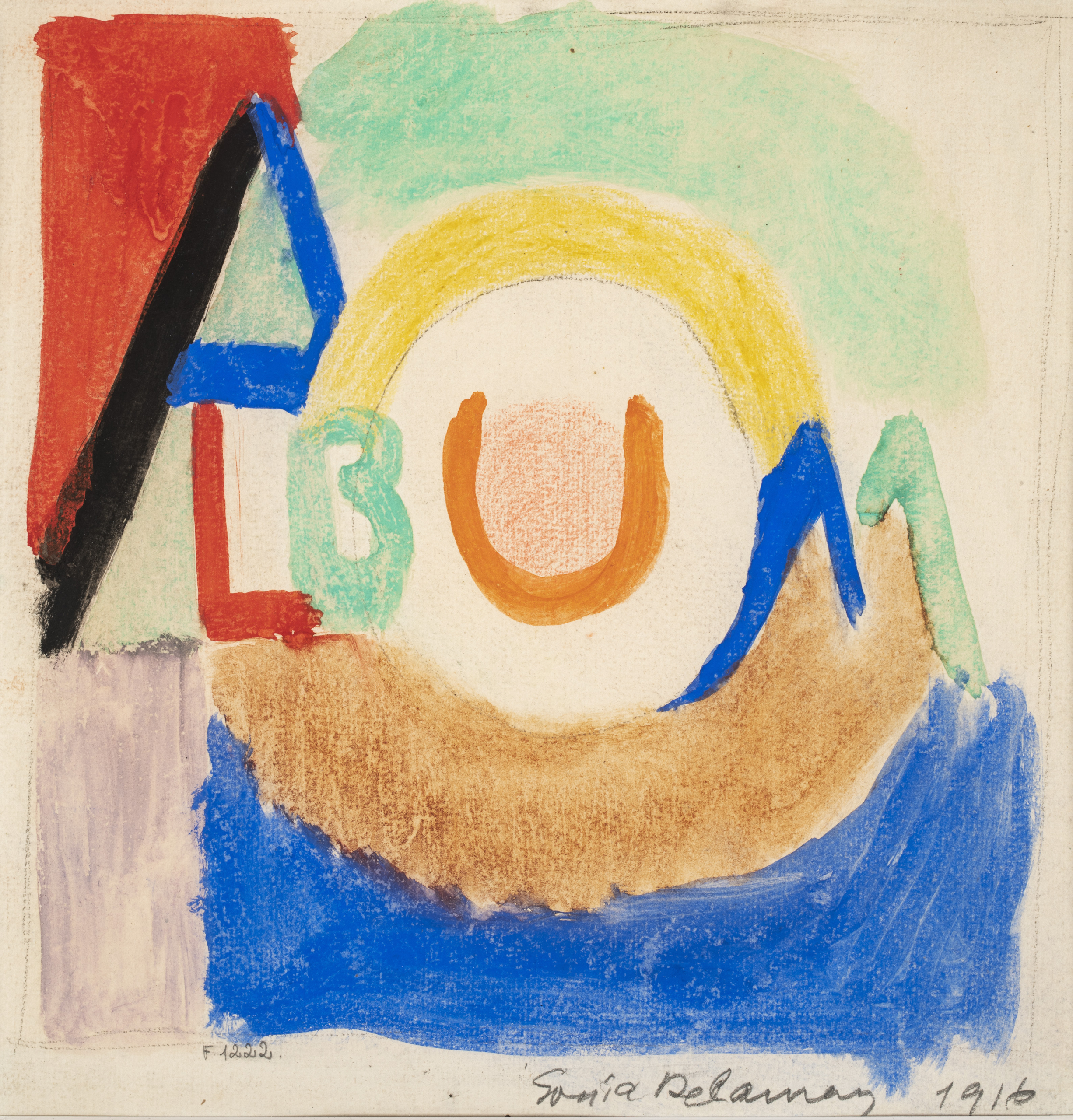 Cette pièce est la version originale d’un pochoir produit pour cette même exposition. Si son abstraction est géométrique et toujours organisée par la couleur, les formes sont libres, rythmées, jamais totalement nettes. Loin de l’exactitude des contours typiques de l’art concret, pour lequel le geste pictural doit disparaître et la subjectivité se dissoudre, l’application même des aplats de couleur est palpable, comme si l’artiste affirmait sa présence. C’est là une caractéristique qui s’applique à l’ensemble de l’œuvre de Sonia Delaunay : sa présence dans l’œuvre. La trace de la main qui applique la couleur est évidente et des modifications de couleurs sont parfois visibles. La série des rythmes couleurs des années 1970 présentés ici sont donc emblématiques de cette liberté, qui aboutit à une synthèse radicale des formes, comme si Sonia Delaunay allait jusqu’au bout des possibilités du “ simultanisme ”. Mais ce caractère programmatique d’une abstraction poussée dans ses retranchements s’unit à une imperfection assumée, qui rappelle toujours le “ métier ” de l’artiste et sa main en pleine action.