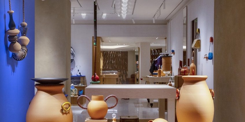 Quatre fois par an, l’accrochage est renouvelé pour accueillir un nouveau récit autour de la re-création. La terre est le premier matériau mis à l’honneur pour l’inauguration du magasin. À cette occasion, les objets créés avec la complicité des artisans potiers de la manufacture Ravel, dans le sud de la France, associent par exemple à une jarre de terre la poignée en cuir d’un sac Kelly. Autres créations particulièrement innovantes, des coupes en cuir réalisées entièrement sans couture, moulées dans l’atelier comme des poteries. Pour Godefroy de Virieu, « ces deux univers aux origines fondamentales et symboliques se confondent dans ces collections éphémères, révélant des savoir-faire ancestraux chers à la maison qui soulignent à la fois la simplicité et la technicité des gestes des artisans».