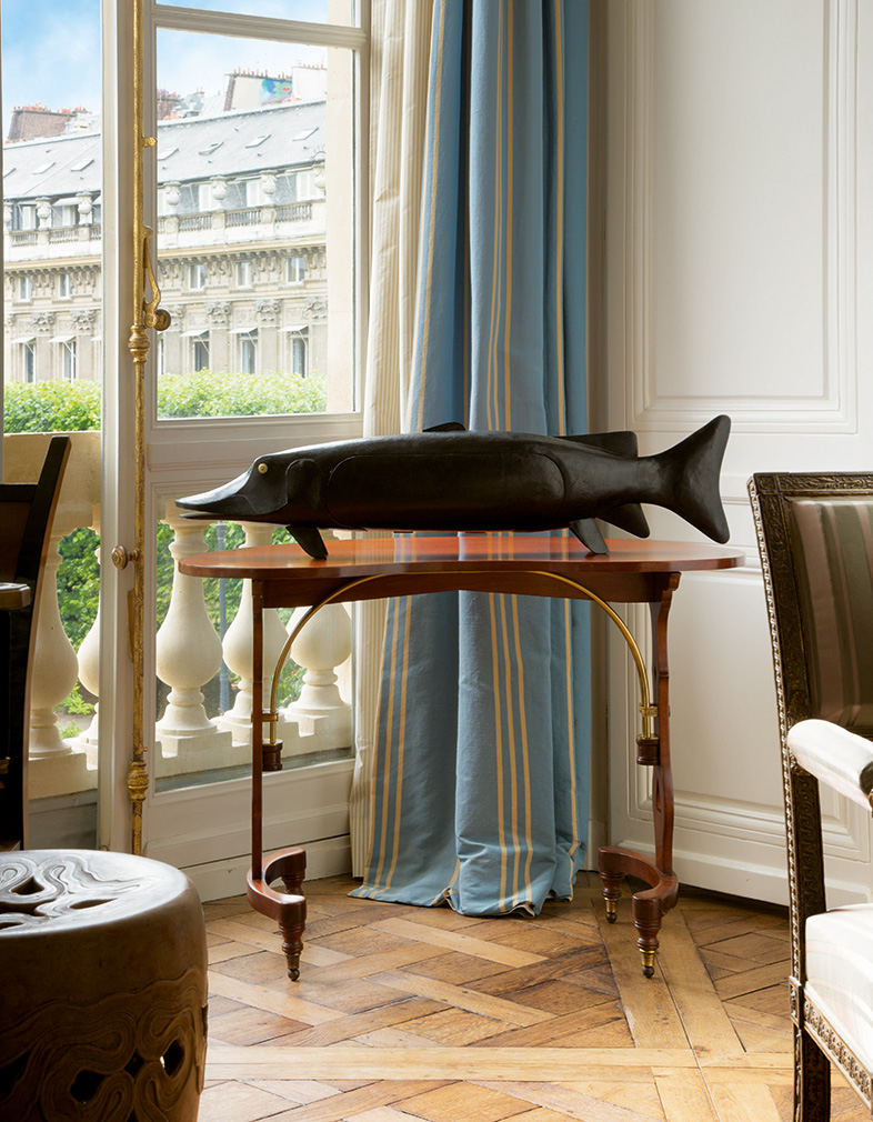 Depuis les années 1980, il vit dans l’ancien appartement de Colette, sur les jardins du Palais-Royal. La méridienne en lin beige capitonnée de l’écrivaine est là pour le rappeler. Ici, celui qui a fait ses premiers pas dans le métier avec l’antiquaire et décorateur Henri Samuel, a créé un décor qui mélange les époques, les styles et les pays pour le mobilier comme pour les oeuvres d’art : Alexandre Noll côtoie Max Ernst, Damien Hirst Jean-Michel Franck, Gerrit Thomas Rietveld Victor Brauner, Niki de Saint-Phalle Pablo Picasso, Daniel Buren ou François-Xavier Lalanne.